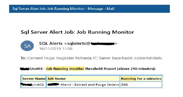 Similarly, we would receive an alert if some jobs would run abnormally and such monitoring can be frequently run (in my case it is run hourly):